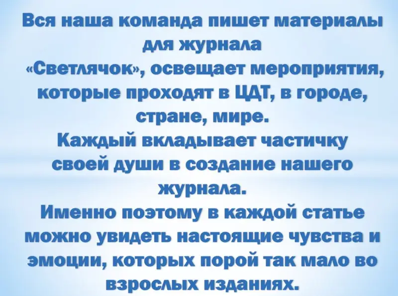 Наша редакция работает по законам Светлячка, героя журнала: она приносит людям радость и только живые эмоции, корреспонденты светятся творческой энергией и работают на счастье наших любимых читателей. А так же, как светлячки, освещают мир вокруг!