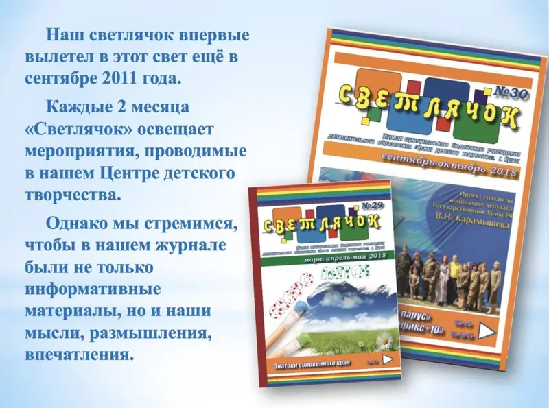 Журнал «Светлячок» – это способ проявить творческие способности, эффективное средство повышения интереса к учёбе (заметно улучшаются показатели в таких предметах, как русский язык, литература, обществознание, история, английский язык – был опыт написания статей на русском и английском, общение со студентами-иностранцами, которым помогали писать статьи на русском языке).