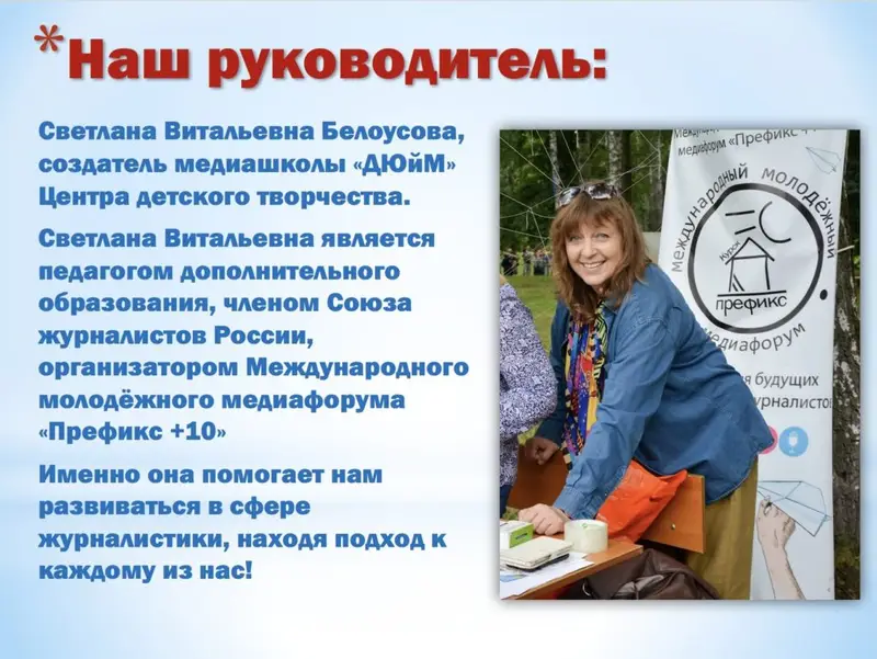 Наш руководитель – Светлана Витальевна Белоусова, руководитель медиашколы «ДЮйМ», педагог дополнительного образования МБУ ДО «Центр детского творчества».